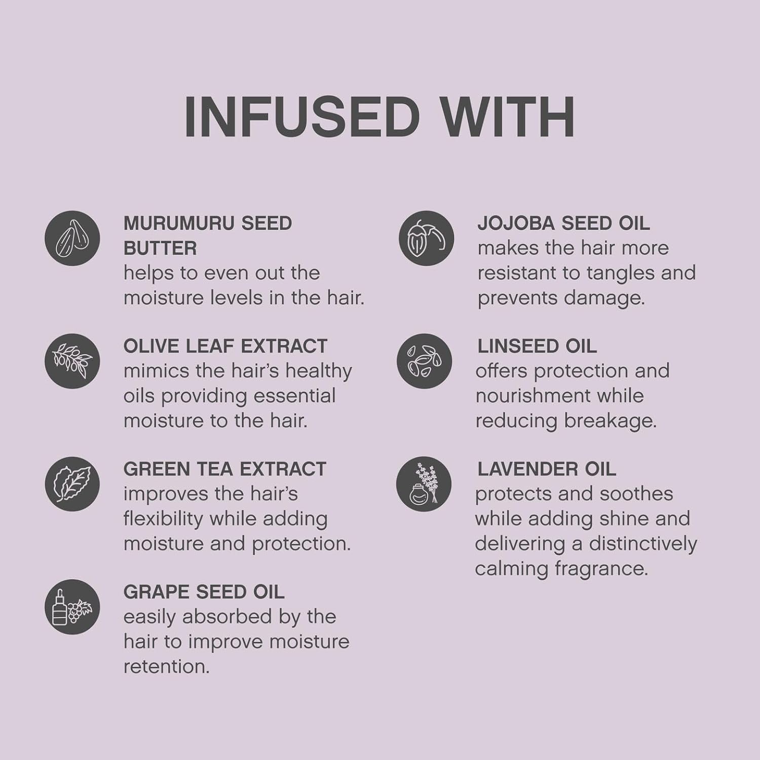 - Hair Repair & Shine: This glossy hair treatment is infused with Murumuru Seed Butter and Olive Leaf Extract to moisturise and protect