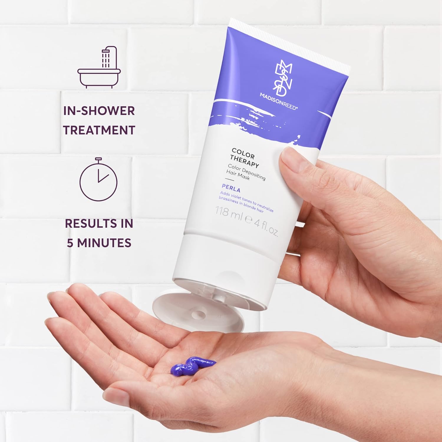 - COLOR DEPOSITING HAIR MASK: Madison Reed Color Therapy in Perla works best on light to dark blondes, as well as brunettes with highlighted hair, and adds violet tones to neutralize brassiness and unwanted yellow tones. Not intended for gray coverage.